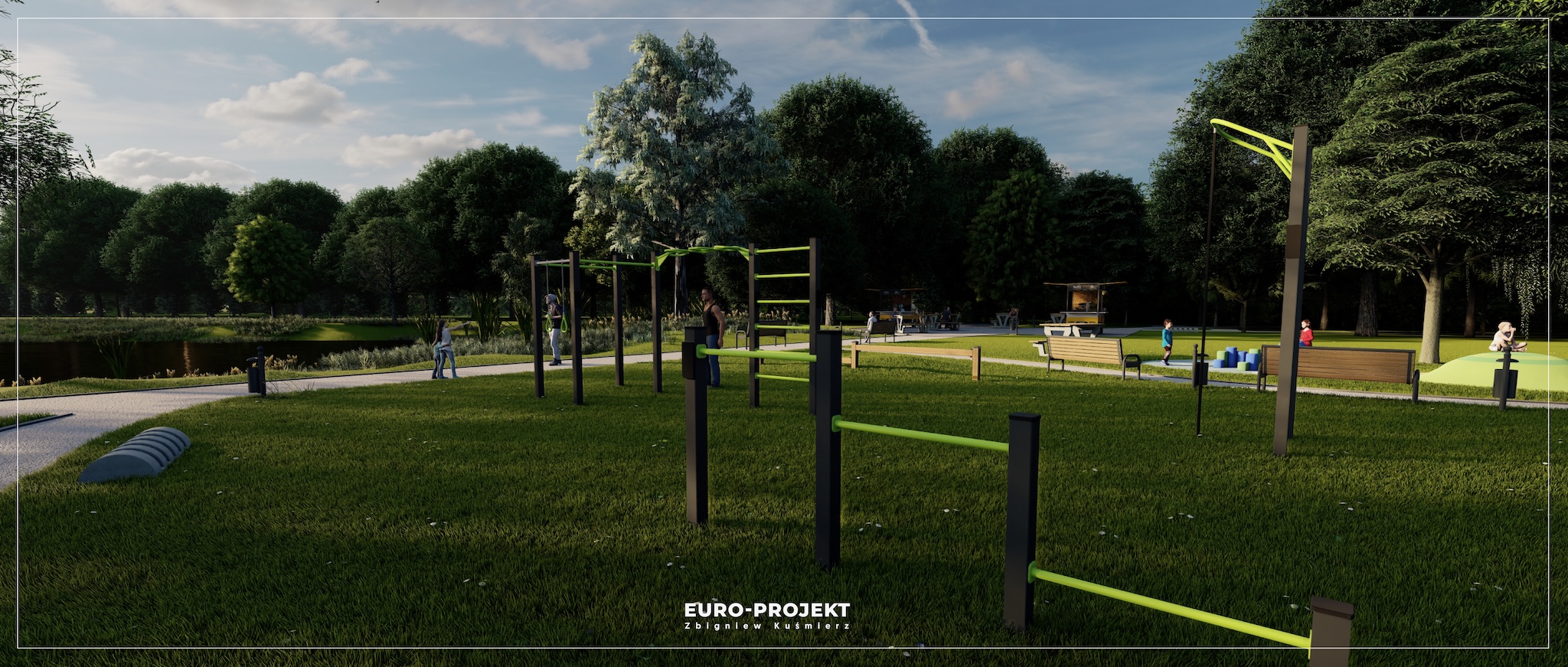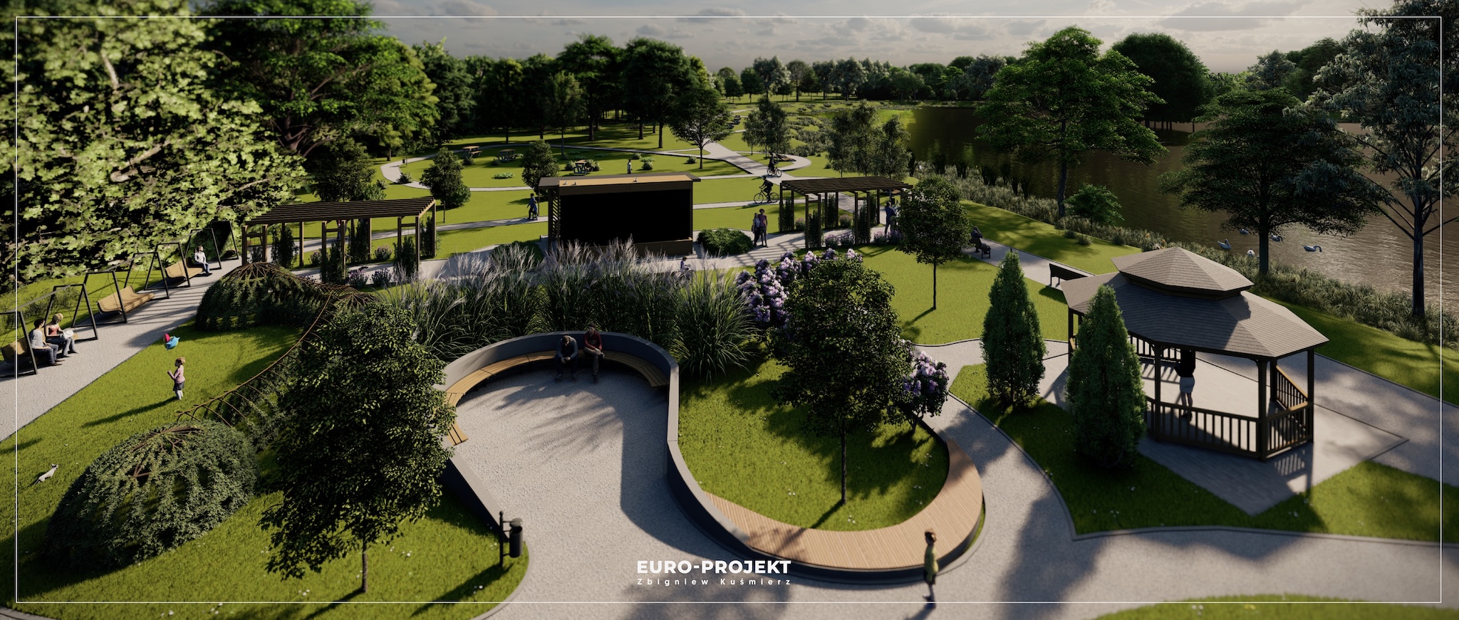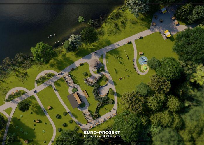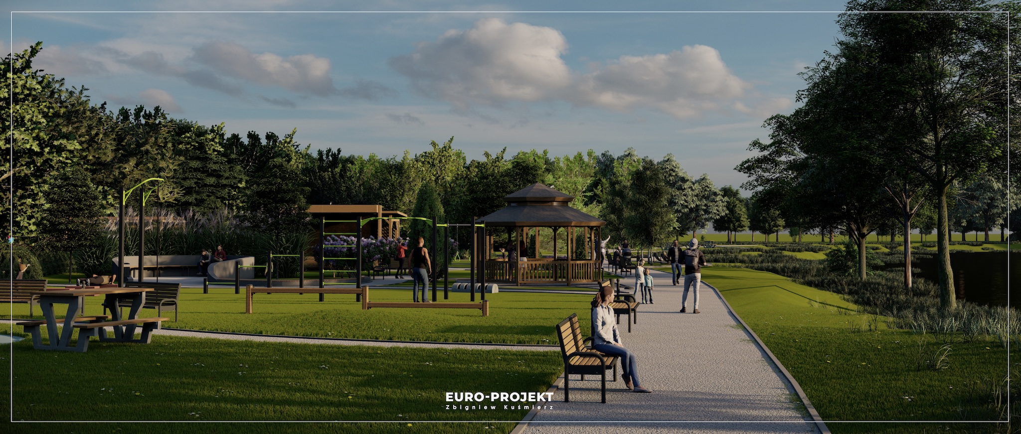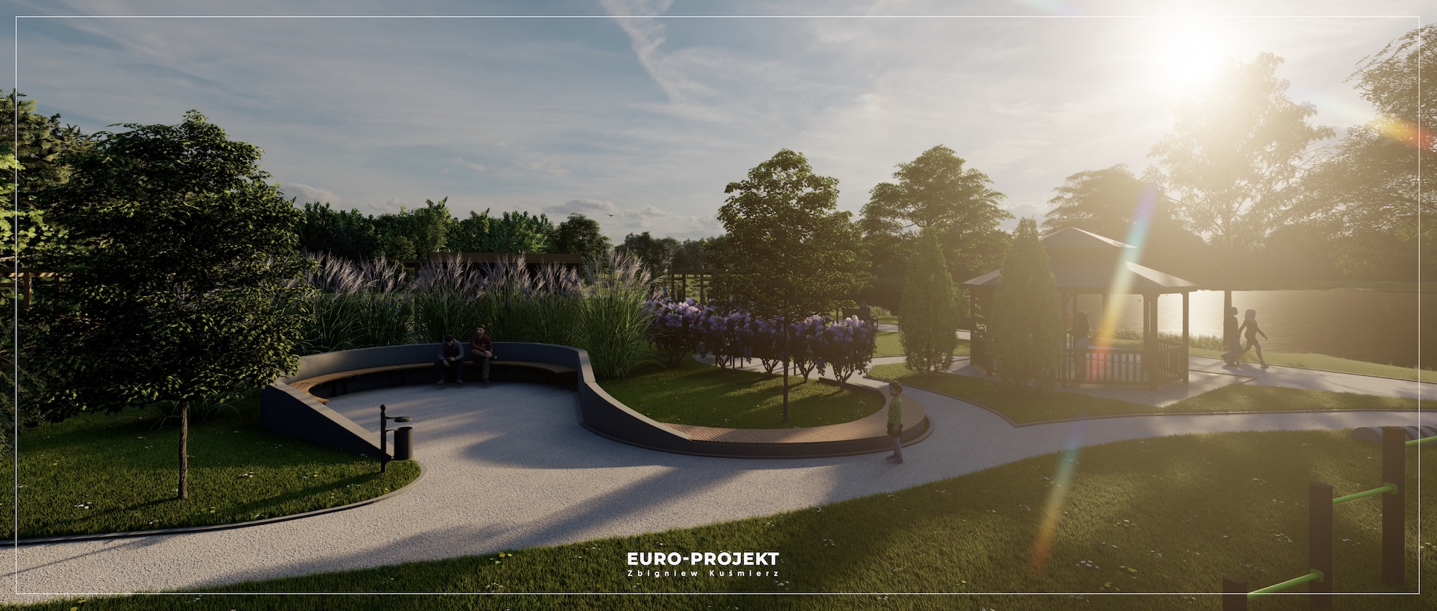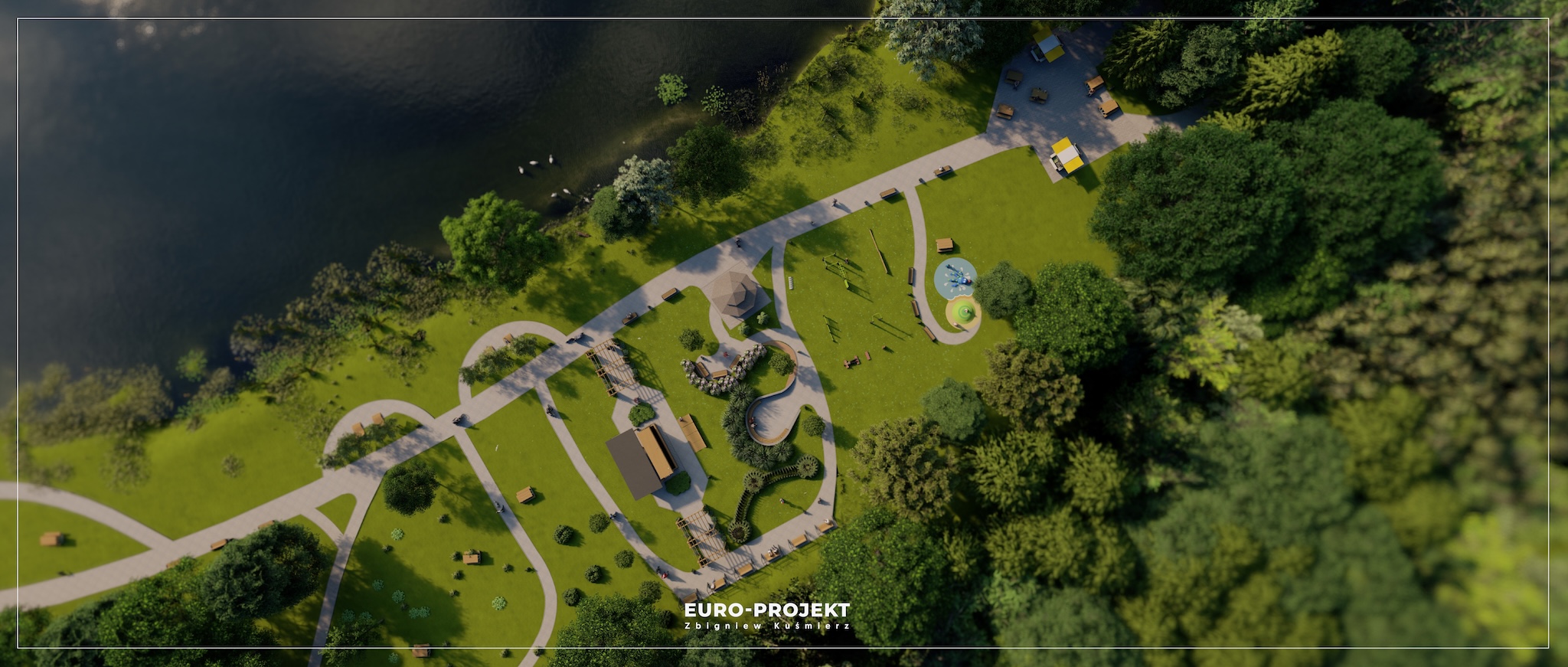Projekt zagospodarowania terenów nad jeziorem Piekiełko w Braniewie, zakładający budowę zewnętrznej tężni solankowej, siłowni, placu zabaw oraz założenia ogrodowo-parkowego.