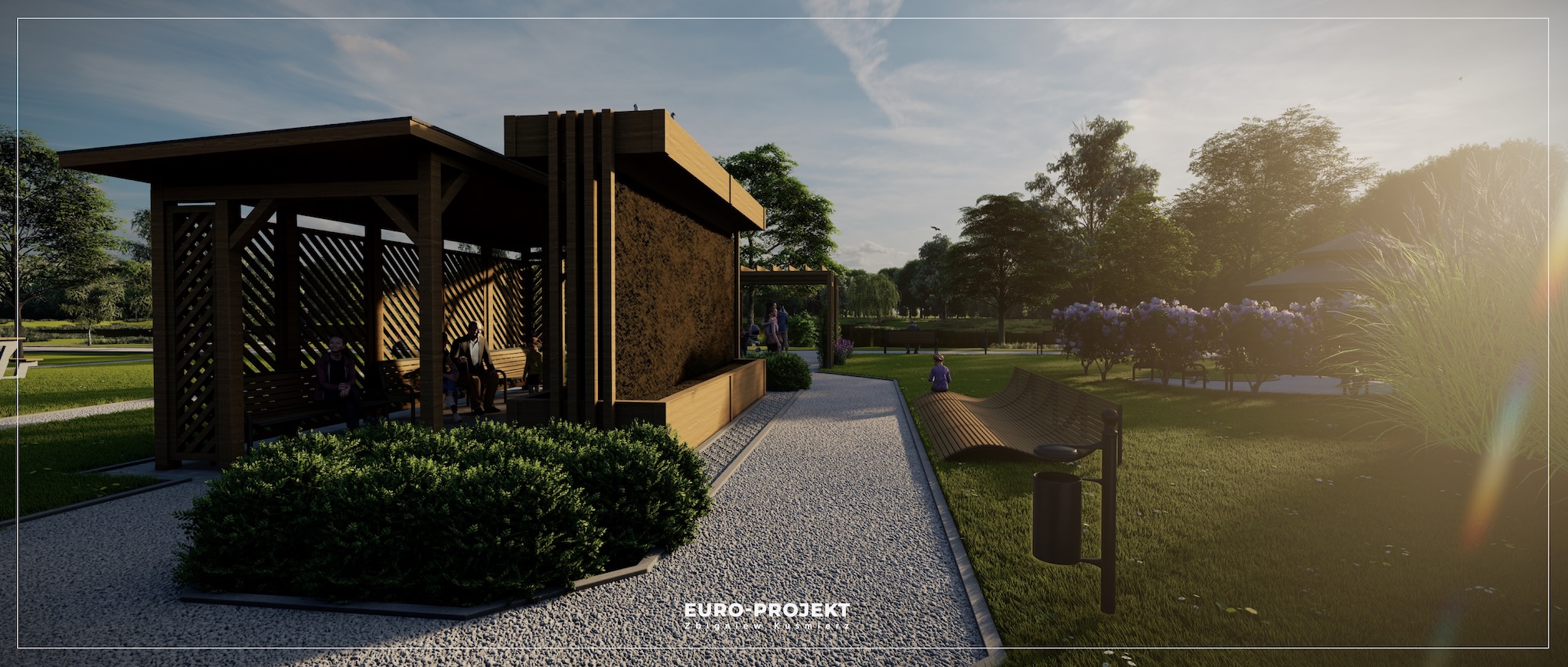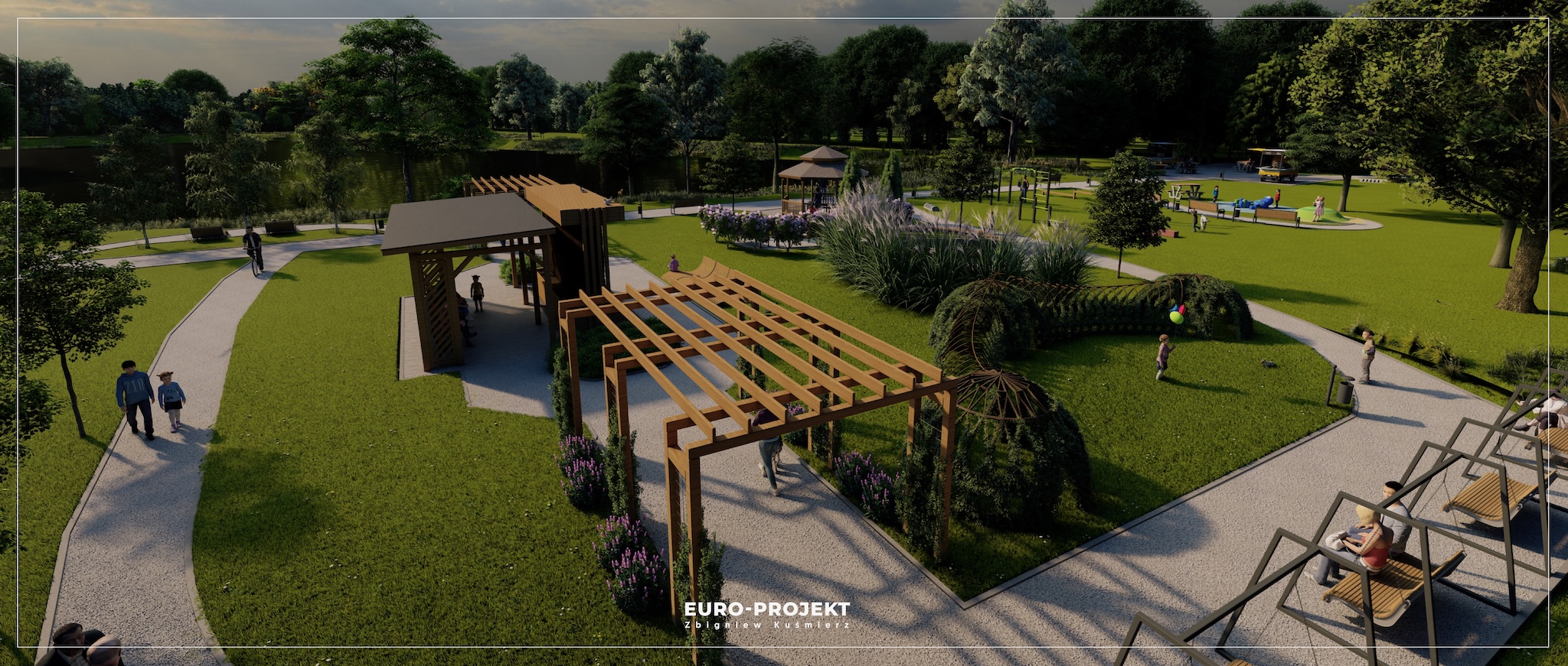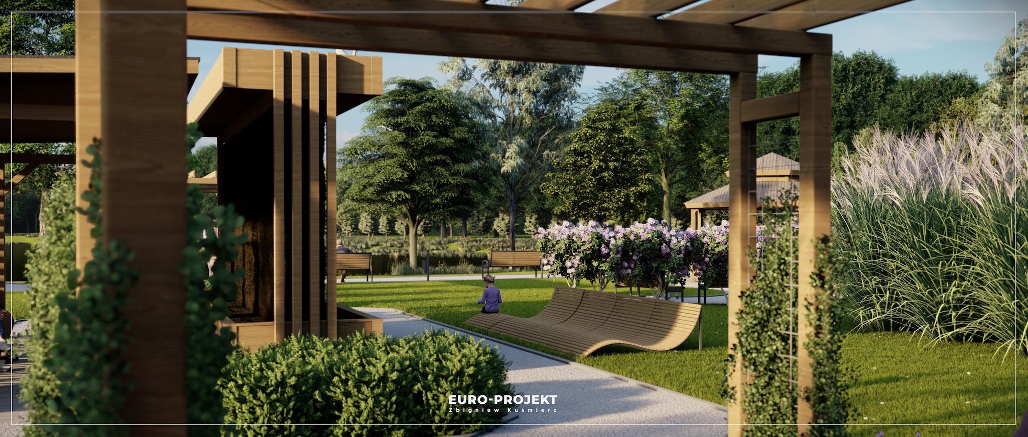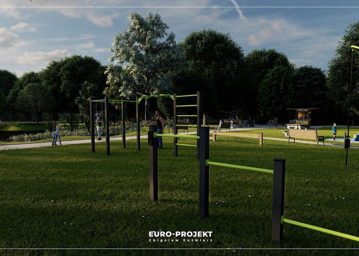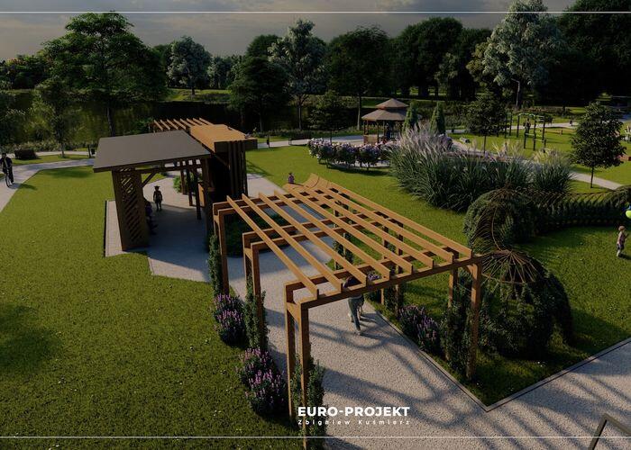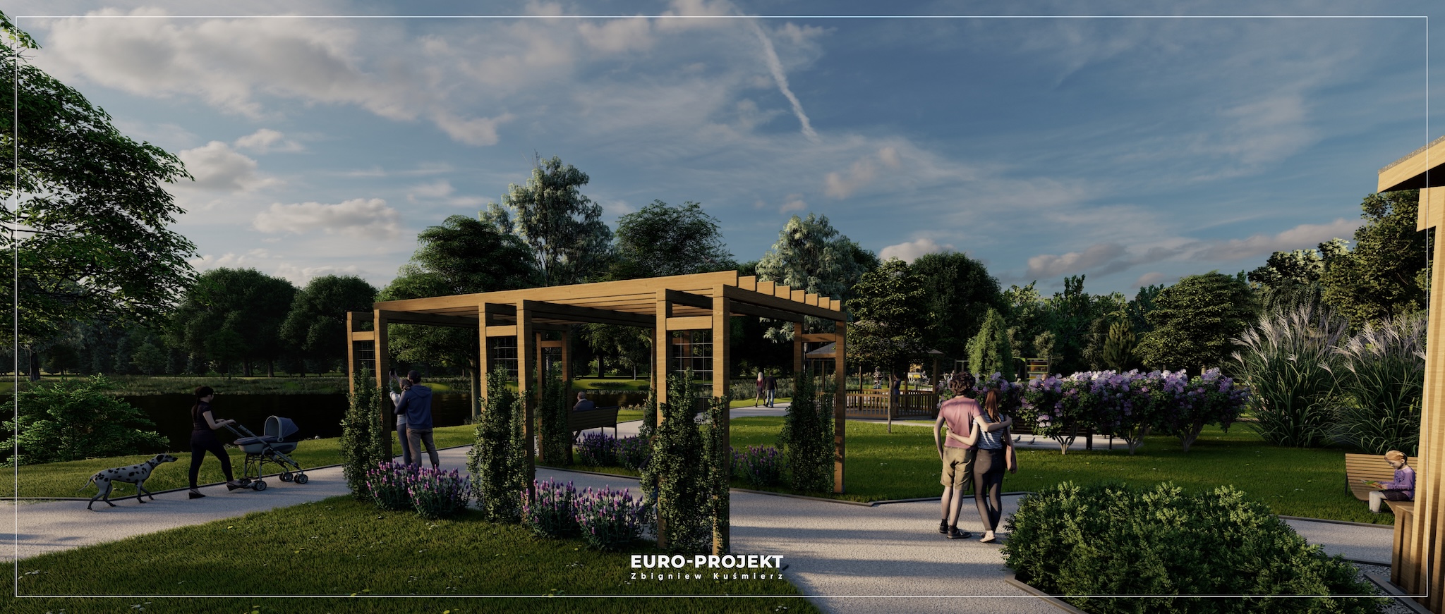 Projekt zagospodarowania terenów nad jeziorem Piekiełko w Braniewie, zakładający budowę zewnętrznej tężni solankowej, siłowni, placu zabaw oraz założenia ogrodowo-parkowego.