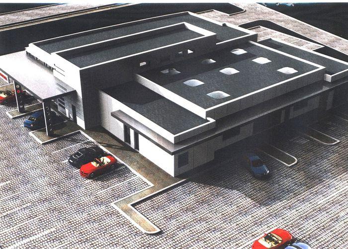 Budynek salonu samochodowego, przekryty płaskimi dachami. Budynek liczy dwie kondygnacje.